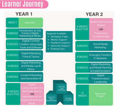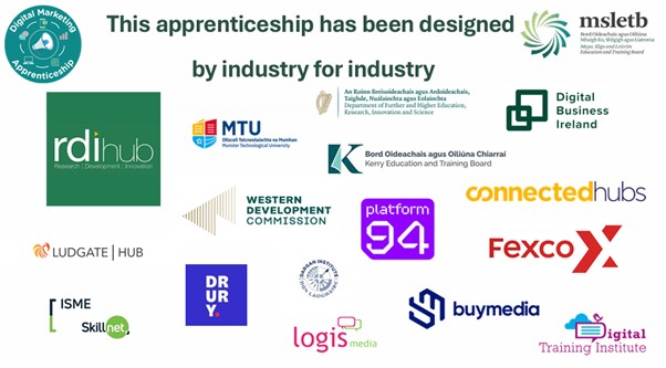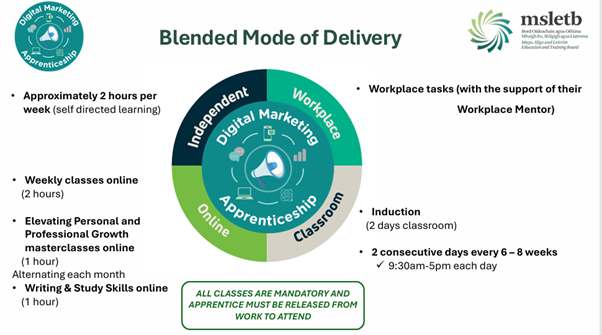 The Digital Marketing apprenticeship is a two-year fully funded programme coordinated by Mayo, Sligo, Leitrim Education and Training Board (MSLETB). It is offered in several locations across Ireland.
