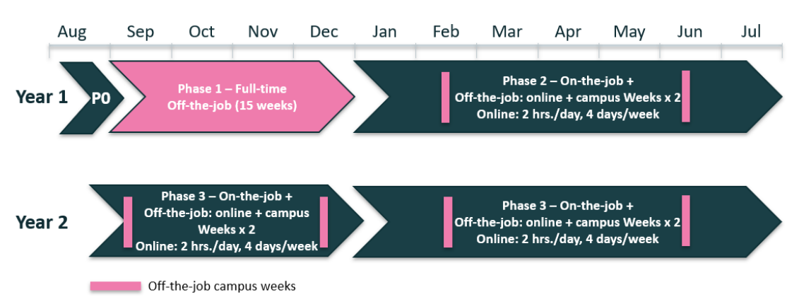- Continues mainly on-the-job with online sessions and structured off-the-job weeks.