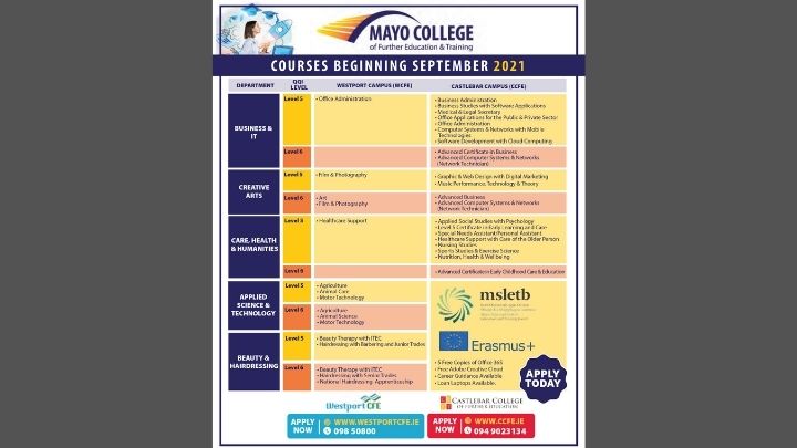 Applications Open for Mayo College of Further Education & Training September 27, 2021
