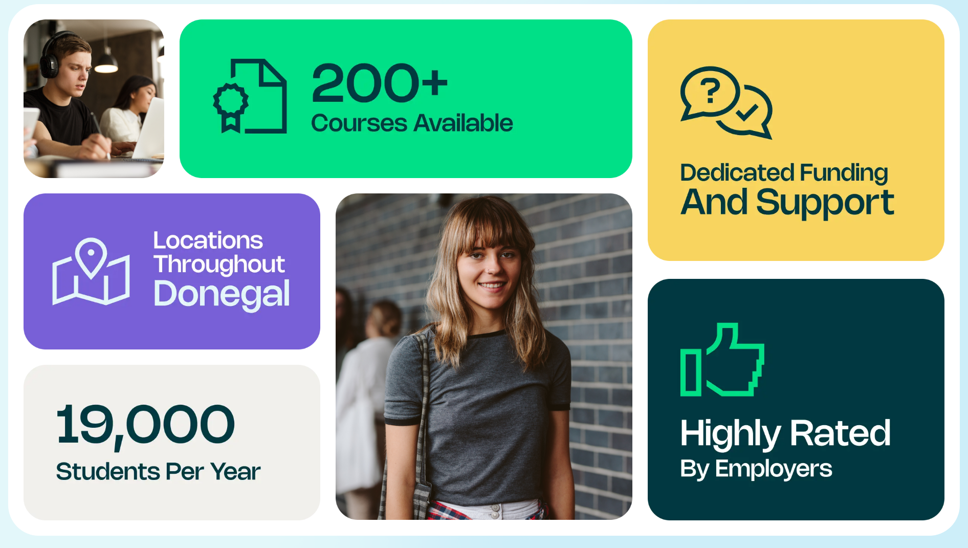 Donegal College is your local gateway to high-quality, flexible, and inclusive education and training. Whether you’re looking to upskill, reskill, return to education, or take the next step in your career, we offer a wide variety of full-time and part-time courses across multiple sectors.