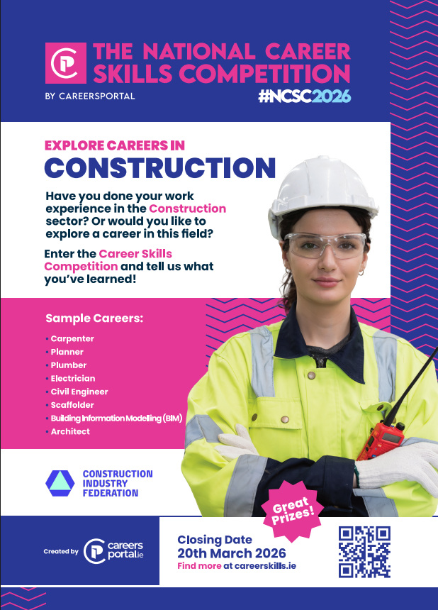 Open to second level (TY, 5th & 6th year) students who have completed a work experience placement related to the Construction industry or who would like to complete a career investigation on a future careeer of interest to them in the construction industry.