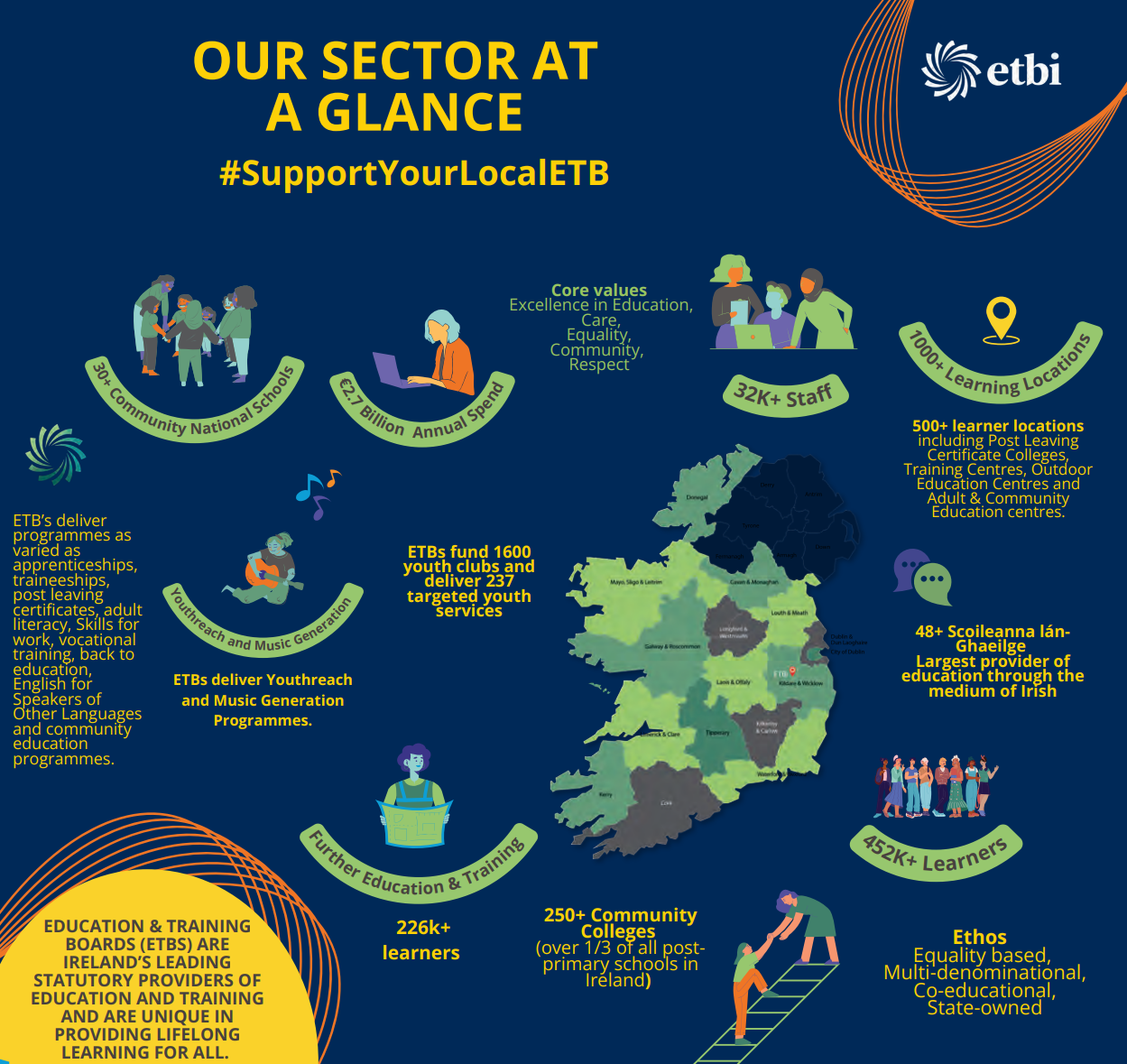 SOLAS operates under the aegis of the Department of Education and Skills and, in conjunction with the Education and Training Boards, is responsible for the integration, coordination and funding of a wide range of further education and training programmes. Some 34,000 learners participate in Post Leaving Certificate Programmes annually.