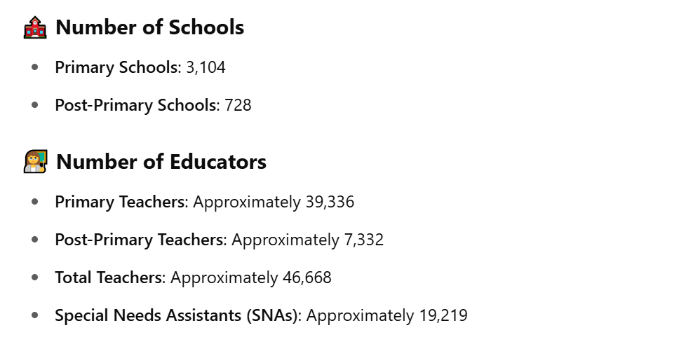 Primary level ~ Nearly 40% of four-year-olds and almost all five-year olds are enrolled in infant classes in primary schools. They complete 8 years in primary school. There are some 3,300 primary national schools, catering for of the order of 536,317 pupils. Approximately 32,800 teachers are employed at primary level.
